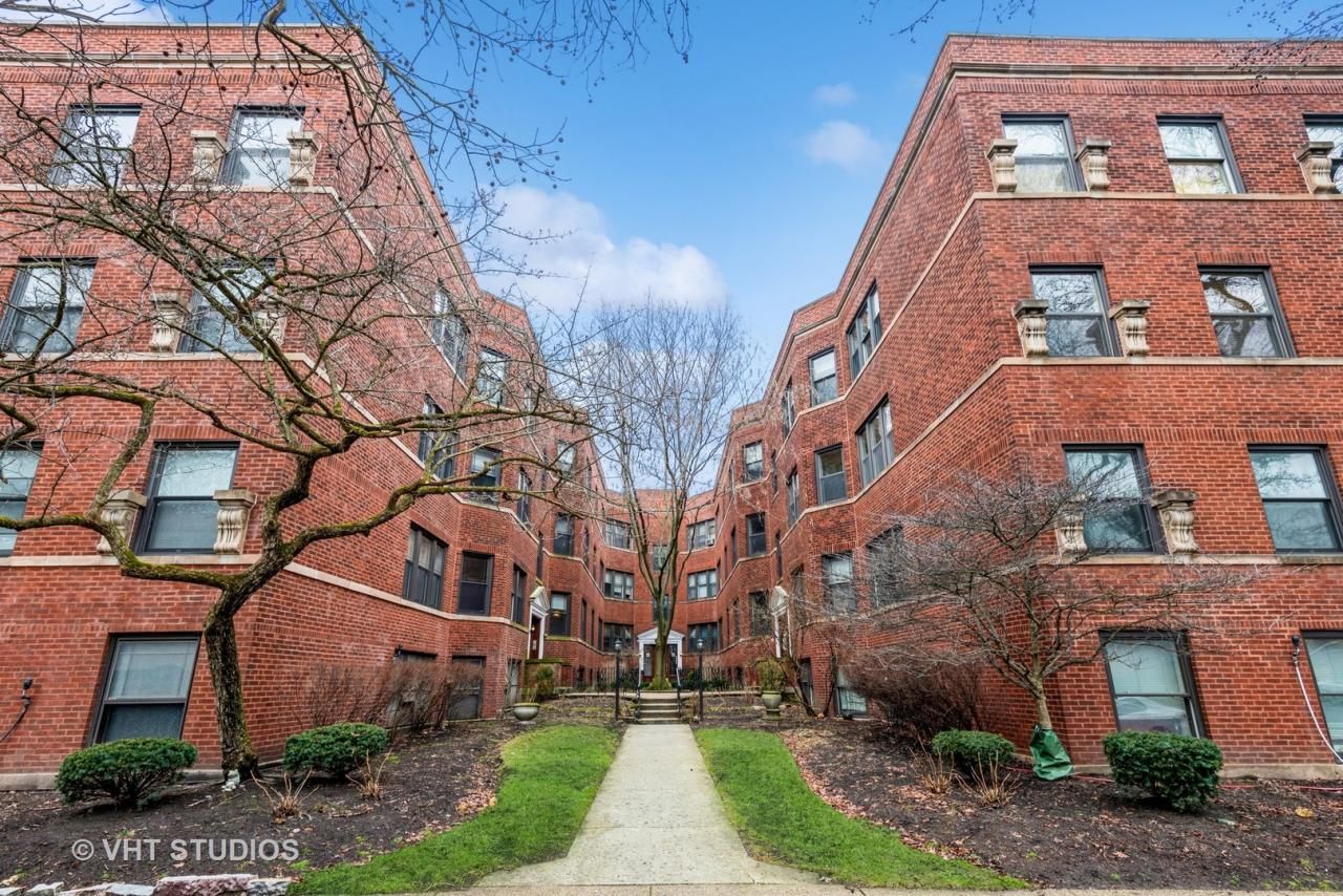 Wonderful vintage 2 bedroom/1 bath in SE Evanston located just 1 block to South Blvd beach and the lakefront This desirable end unit offers sunrise views from both east facing bedrooms and is graced with lovely architectural details. LR features hardwood floors, crown molding and decorative fireplace flanked by built-in bookcases and flows into the formal DR with French doors - the perfect setting for family gatherings and special celebrations. Recent updates include 2021 kitchen remodel with new cabinets, refrigerator, stove, sink, countertop and flooring. New bathroom cabinet and lighting and both bedrooms, DR and hallway repainted in 2021. Windows replaced 2006. Recent building improvements include roof replacement 2021, new boiler 2020 and tuckpointing 2018-2021. Laundry and storage conveniently located below unit. Easy street parking or Evanston City lot across the street. Short walk to both CTA Purple line and Metra as well as numerous cafes and boutiques on Main St. There is so much to love in this well maintained Pre-war building with pretty landscaped courtyard.